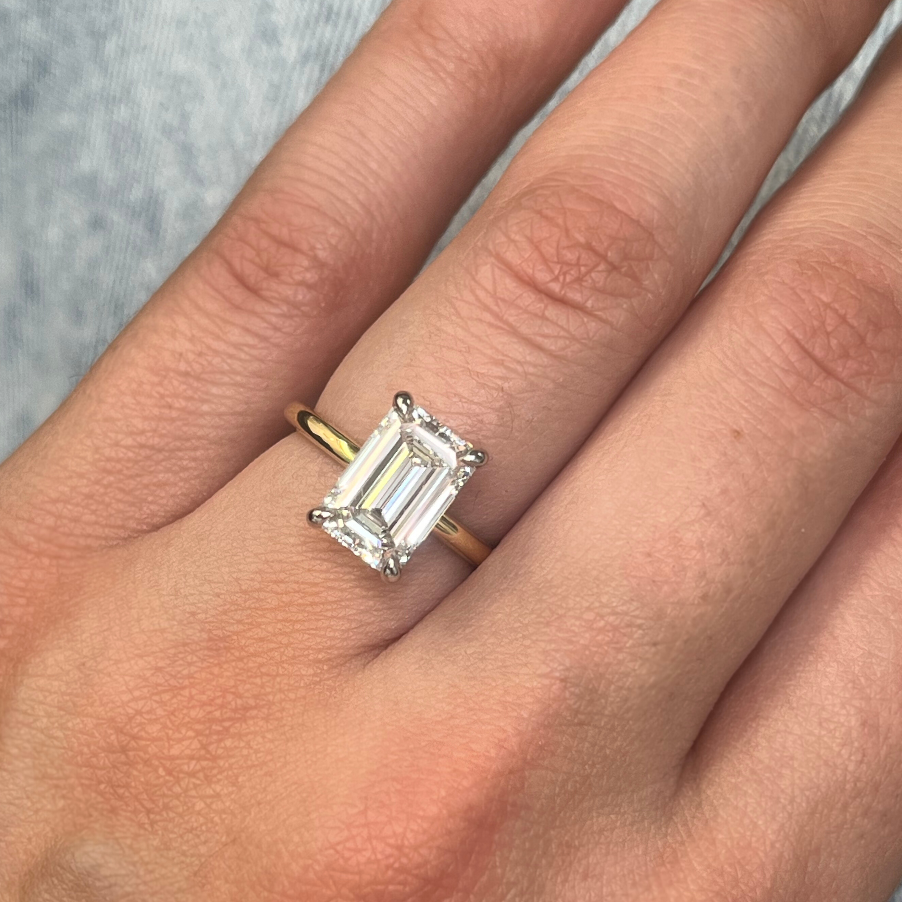 - Shown with a 3ct emerald cut diamond